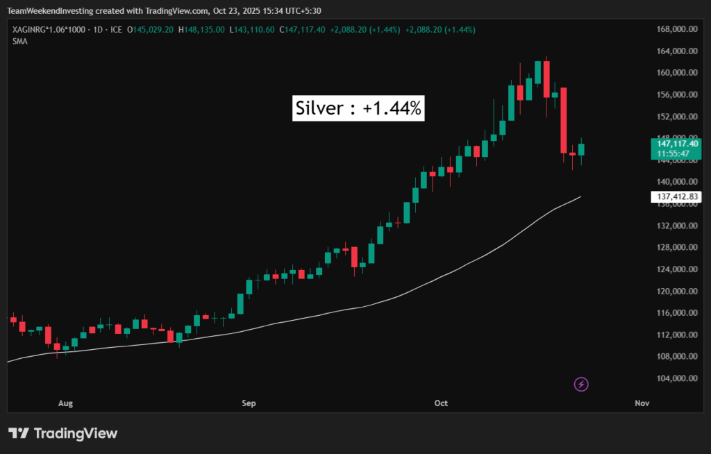 Silver too has seen sharp movements, dropping from ₹1,60,000 per kg to ₹1,42,000 and then recovering slightly to ₹1,47,000. Some consolidation in precious metals now seems likely.