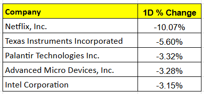 In global markets, sentiment also turned soft. The S&P 500, Dow Jones, NASDAQ, and Russell 2000 were all down, with Netflix tumbling 10% after a long run-up. Other major US stocks like Texas Instruments, Palantir, AMD, and Intel also fell.