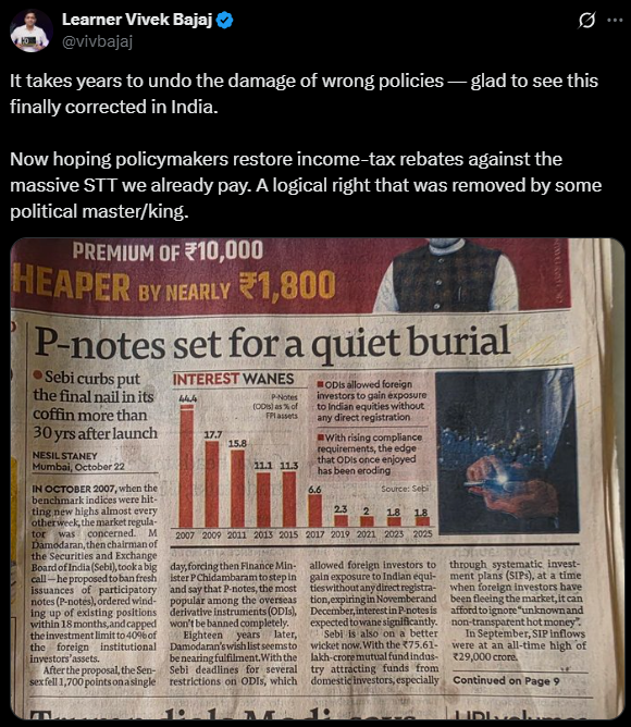 Another topic of discussion was the Securities Transaction Tax (STT). Many veteran investors remember when STT was introduced as a small tax on trades to track market transactions. Initially, it was treated as advance tax, meaning it could be adjusted against total tax payable at the end of the year. But after some misuse by a few bad actors, the government changed the rule in the mid-2000s, treating STT as a cost rather than a tax credit. This has long been viewed as unfair by traders, since it remains a tax but is not treated like one for accounting purposes. There is hope that the Finance Ministry will revisit this issue in the future to restore fairness and transparency.