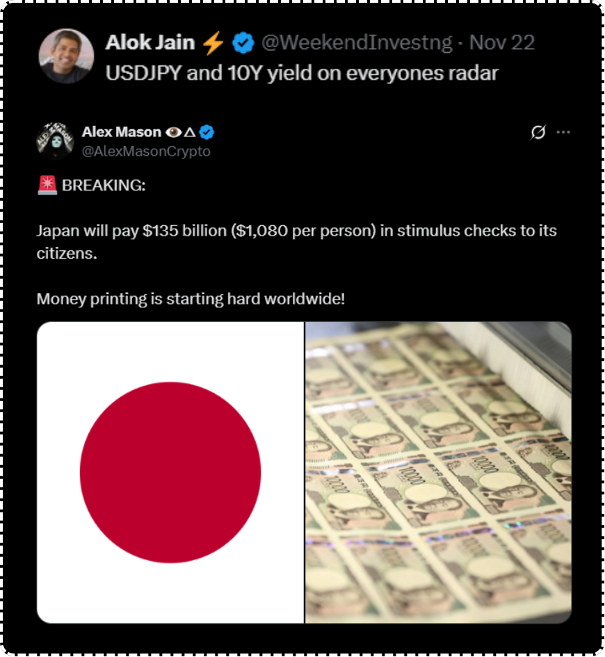 The other tweet concerns the Japanese yen and the rising yields. Japan is initiating a huge stimulus by distributing checks of $1,000 per person to its citizens, adding to the ongoing global money printing. The US is doing it, Japan is doing it, and even India is doing it through various schemes.
