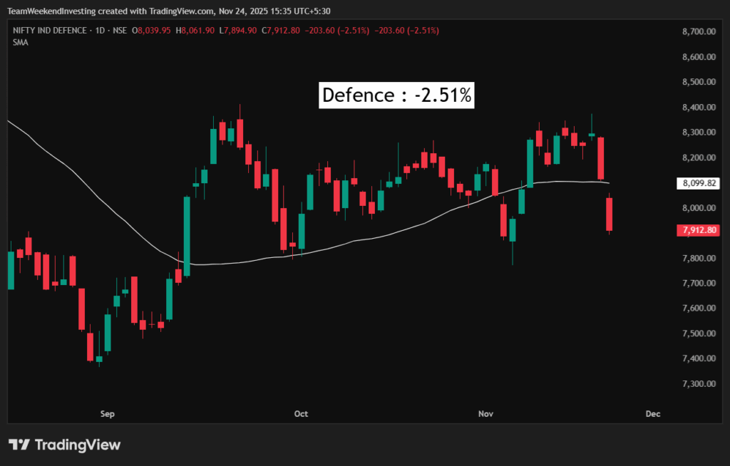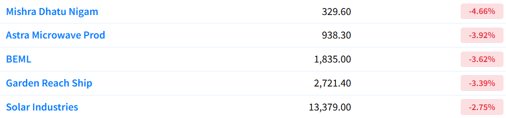 The defense index has now virtually come back to its September levels, with Mishra Dhatu Nigam, Astra Microwave Products, BEML, Garden Reach Shipbuilders, and Solar Industries leading the sector down.