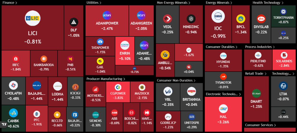 In the Nifty Next 50 space, there was hardly any green, with only Canara Bank showing a marginal gain. Endurance Technologies, CG Power, Adani stocks, Hindustan Aeronautics, Solar Industries, BPCL, Mazagon Dock, PFC, and IRFC all lost ground for the day.