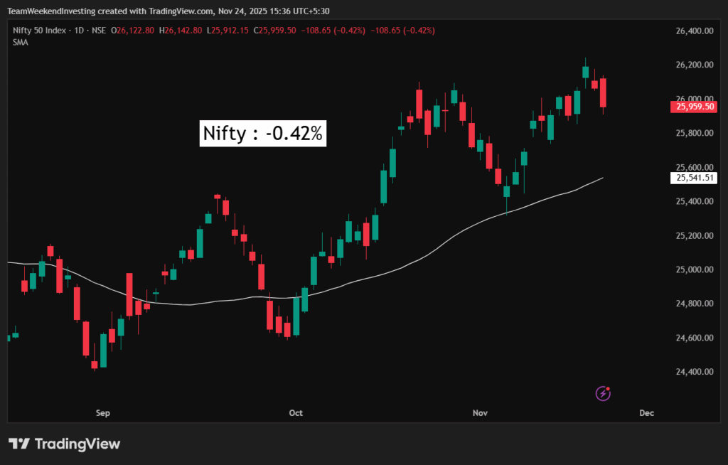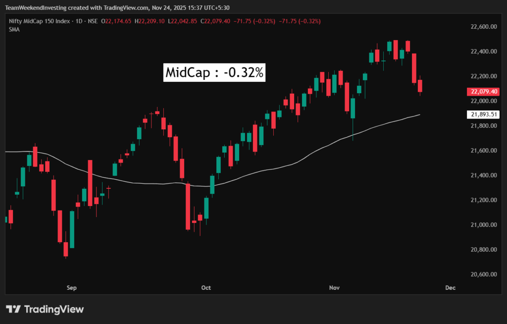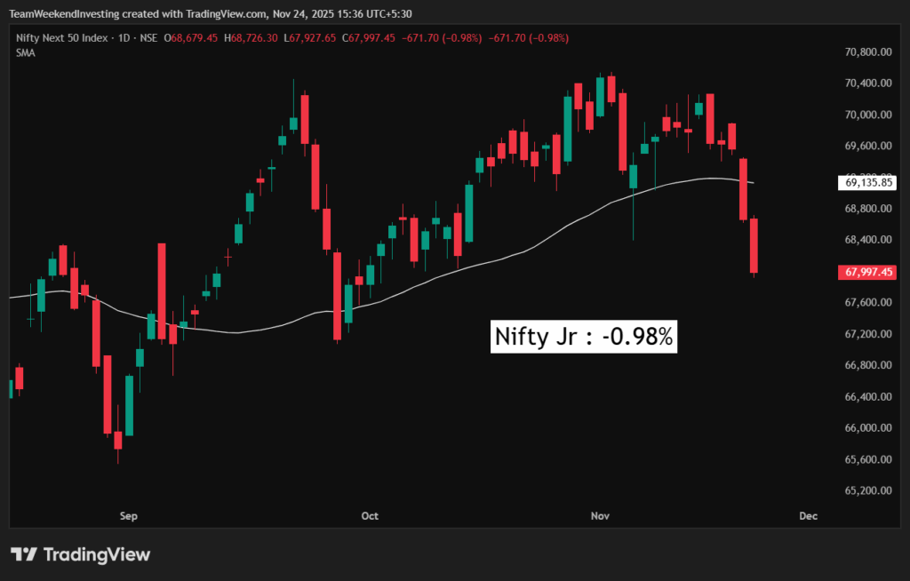 The weakness is more pronounced in the broader market. Nifty Junior was down more dramatically, at 0.98%, bringing it very close to its September lows. This is not a great formation, as the rest of the market appears to be in distress while the Nifty is stuck near all-time highs.