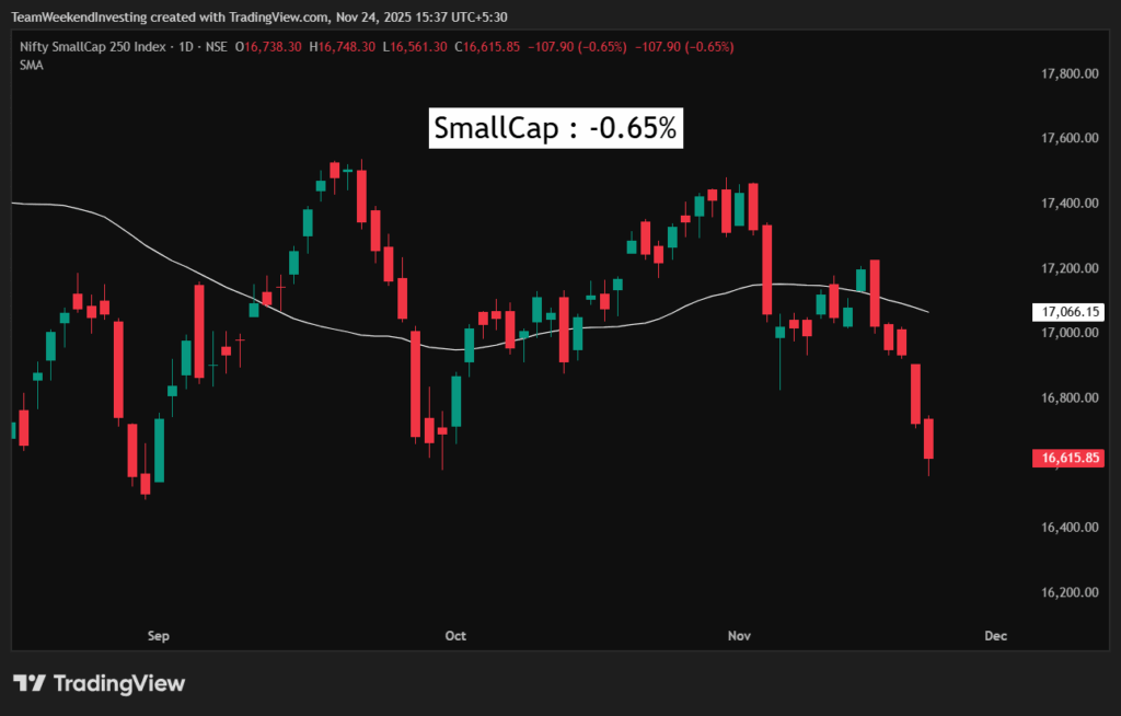 Midcaps were down 0.32%, and Small caps were down 0.65%. The small-cap index has now broken even its September low, having bounced two or three times from the 16,500-16,600 level previously. We will have to see what happens this time.