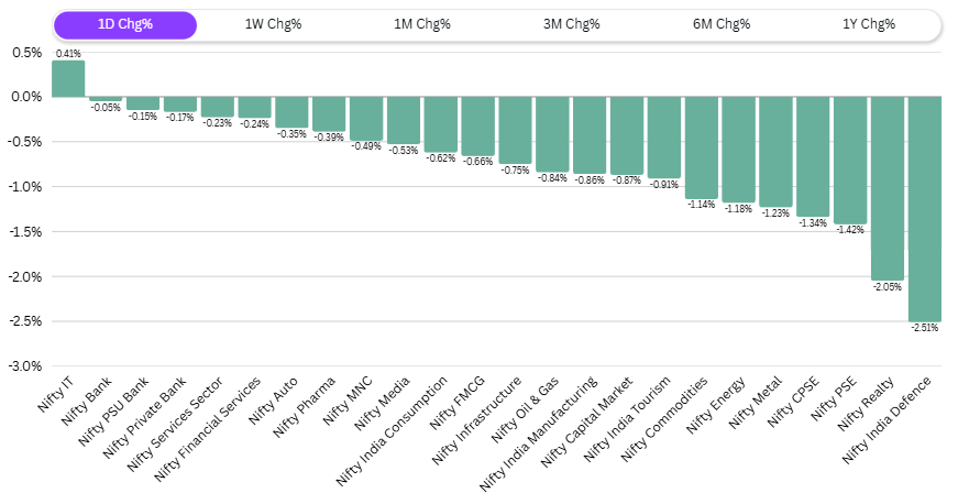 In the Sectoral Trends, Nifty IT managed a 0.4% gain, standing out as the sole sector in the green. All other sectors lost ground, led by Defense, which lost the most at 2.5%. Real Estate was down 2%, and both Public Sector Enterprise and Central Public Sector Enterprise sectors lost 1.4% and 1.3%, respectively. Metals were down 1.2%, and Energy Commodities lost nearly 1%. There was no escape from the selling pressure in any sector except IT.