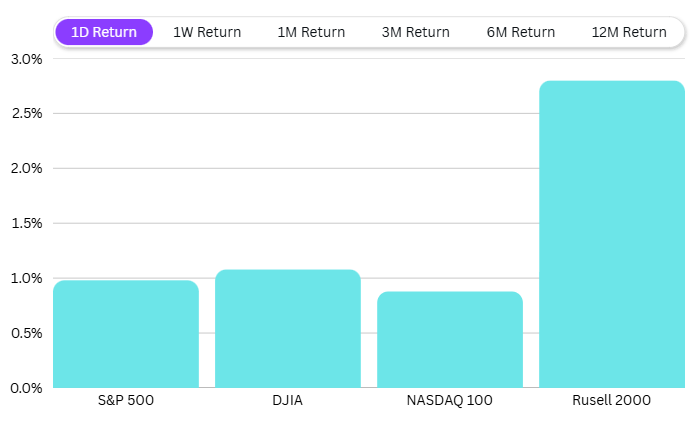 In the previous session, the US market showed decent gains: S&P 500, Dow Jones, and Nasdaq were up approximately 1%, while the Russell 2000 saw a huge markup with a 2.7% gain, reflecting strength in the broader US market.