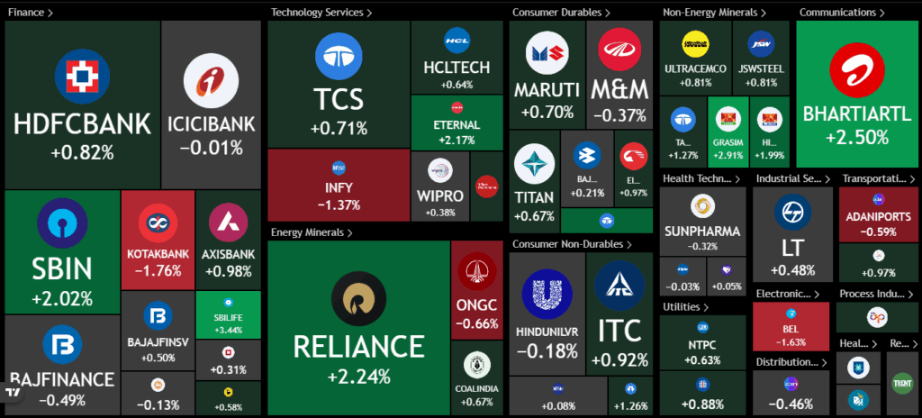 Major gainers in the Nifty included heavyweights like Bharti Airtel, Reliance, State Bank of India, SBI Life, HDFC Bank, TCS, ITC, Tata Motors, Grasim, and Hindalco. Kotak Bank, however, was down after its results, and Infosys also fell 1.3%.