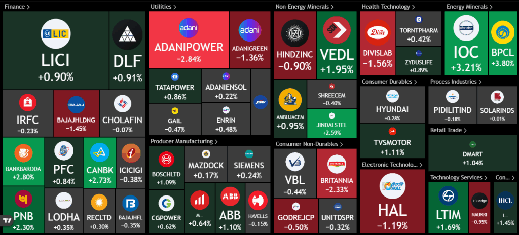 In the Nifty Next 50 space, Adani Power was down 2.8%, along with minor losses in Naukri, Britannia, HAL, and Divis Labs. PSU banks were the standout performers, with gains in Canara Bank, Bank of Baroda, and PNB. Oil and Gas stocks like IOC and BPCL also did well, as did steel and commodity stocks like Jindal Steel and Vedanta.