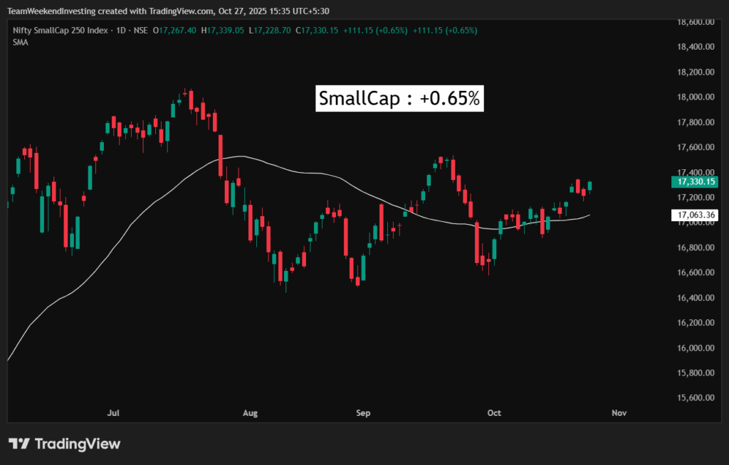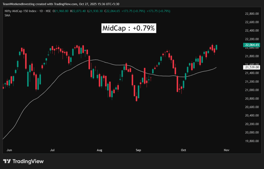 Mid-caps also performed well, closing 0.8% higher — their best close since July. Small-caps were up by 0.65%, though they still lag a bit compared to large caps. It seems that the strength at the top end of the market is pulling the smaller stocks upward.