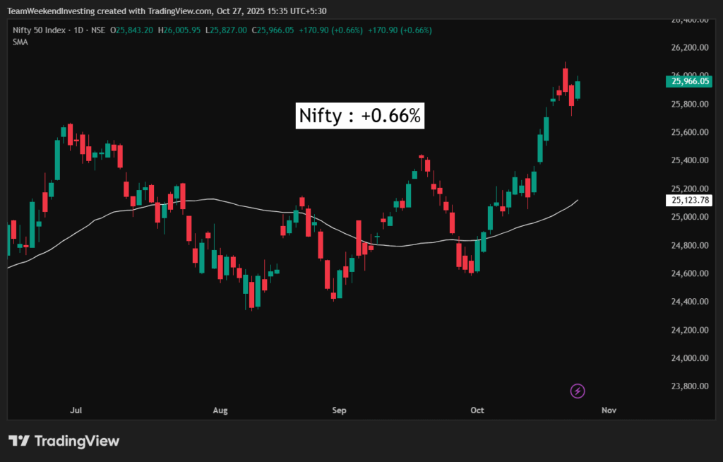The overall market setup looks quite decent. After two strong down days, we saw an up day today. The market closed at a new short-term high, up by 0.66%, and came very close to the 26,000 mark.