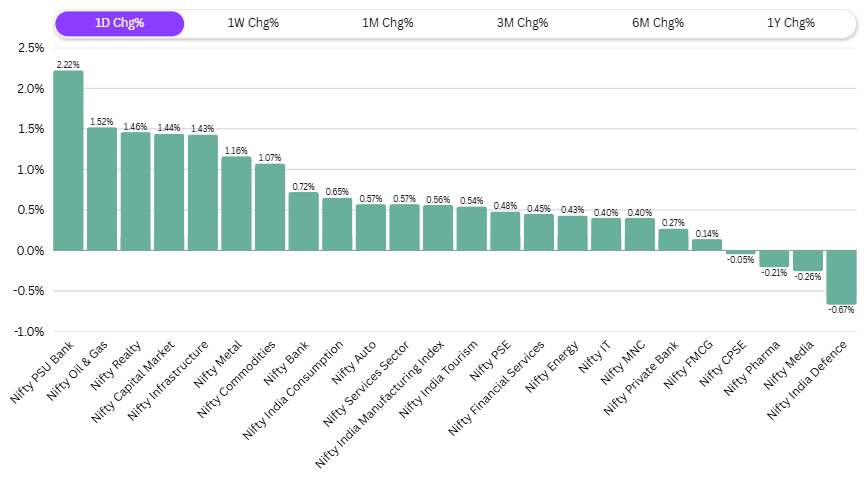 Sector-wise, it was a broadly positive day. PSU banks were the biggest gainers, up 2.2%, followed by oil and gas at 1.5%, and real estate at 1.4%. Defense was the only sector that showed some weakness, down 0.67%.