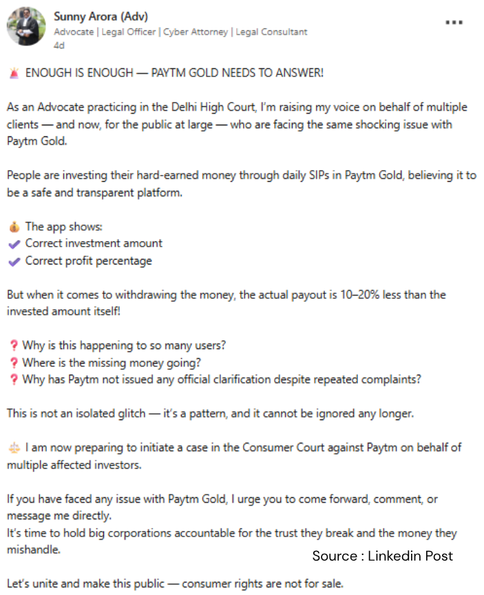 A LinkedIn post by Advocate Sunny Arora caught attention, talking about issues in digital gold. While it’s unclear how accurate the post is, it highlights some real concerns. Digital gold is still an unregulated space, and different platforms are offering varying rates.