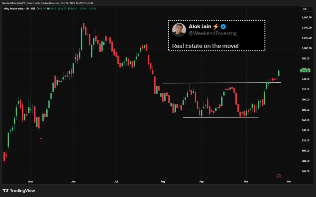Another key point is the sudden movement in real estate stocks. After months of consolidation since June, many real estate counters are now breaking out. The sector seems to be benefiting from expectations of lower interest rates. Home loans are currently around 7.x%, and even a small cut of 0.25–0.5% could boost demand significantly. Lower rates would make many housing projects more attractive, possibly triggering fresh buying interest.