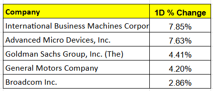 Big names like IBM, AMD, Goldman Sachs, General Motors, and Broadcom led the rally. IBM, in particular, jumped from around $260 to $310 in just two sessions.