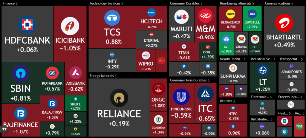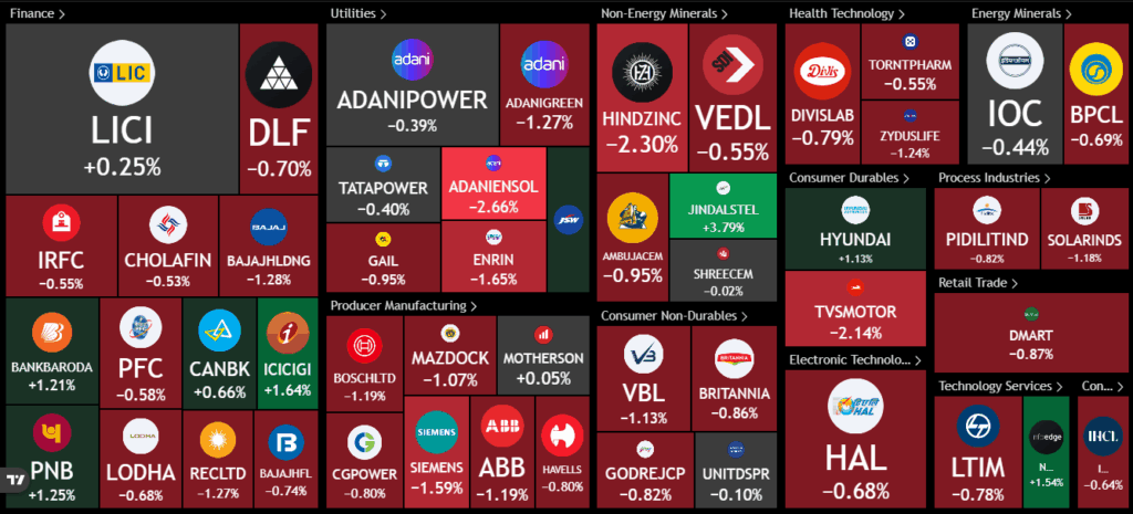 The Nifty heat map was mostly red, with a few greens in metals and banks. Tata Steel, JSW Steel, State Bank of India, Kotak Bank, and SBI Life were slightly positive.