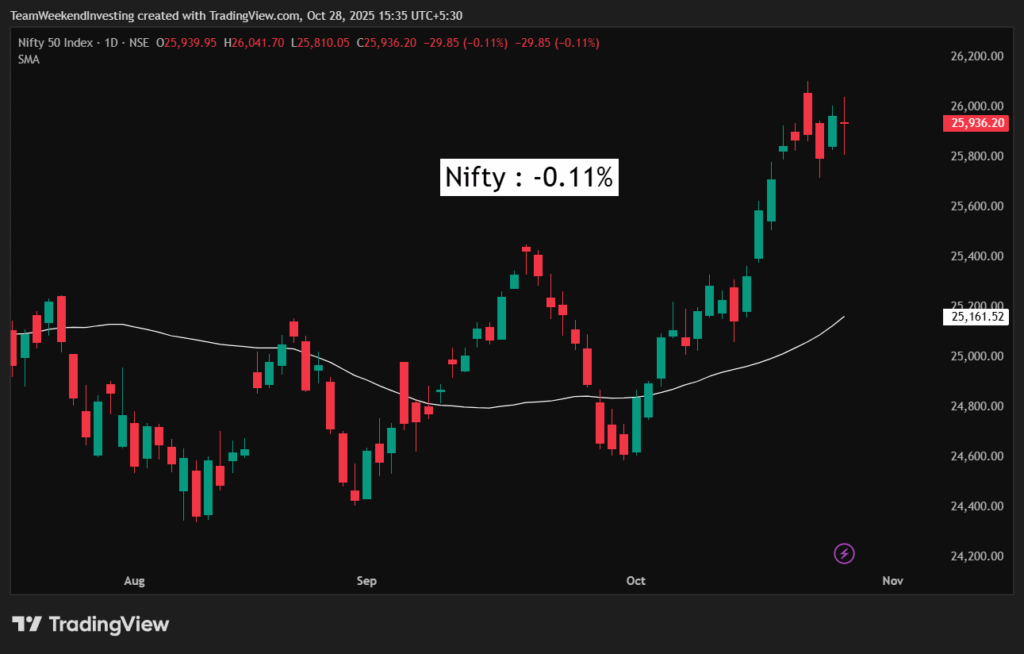 Looking at the Nifty chart, it was an absolute Doji day. A Doji is when the open and close prices for the day are almost the same. Today, we opened at 25,939 and closed at 25,936. This means there was no real body on the candlestick, which is called a Doji candle. It usually shows that the market is indecisive—it doesn’t know whether to go up or down.