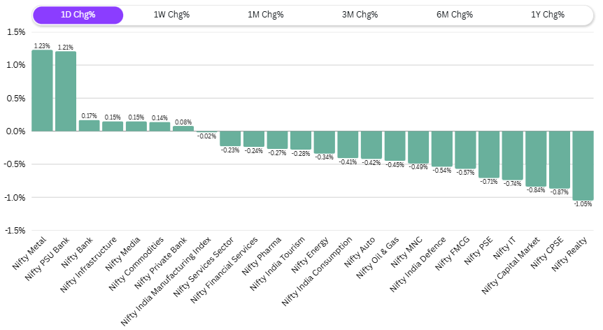 Sectorally, metals and PSU banks led the pack with gains of 1.23% and 1.21%. Nifty Realty fell 1%, and CPSE was down 0.87%. The capital markets, IT, and PSE sectors also fell by more than half a percent.