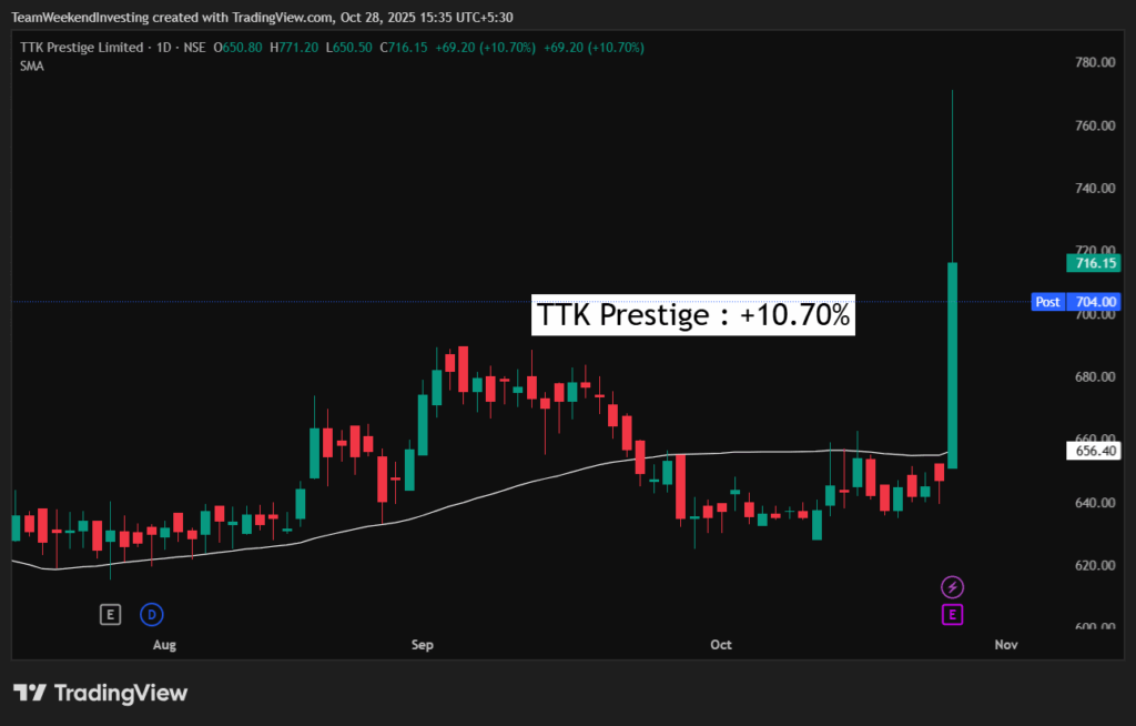 The mover of the day was TTK Prestige, which surprised everyone with strong Q2 results. The stock jumped 10.7% and hit a new high.