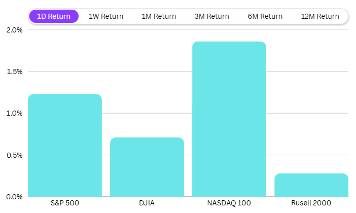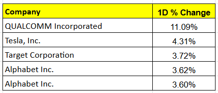 Qualcomm gained 11% in a single day, Tesla rose 4.3%, and Alphabet was up around 3.6%.