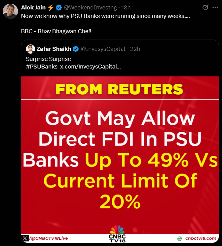Reuters reported that the Indian government may allow direct FDI in PSU banks up to 49%, up from the current limit of 20%. Not many PSU banks even have foreign investments close to that limit, so while this change may not bring an immediate impact, it opens the door for future possibilities.