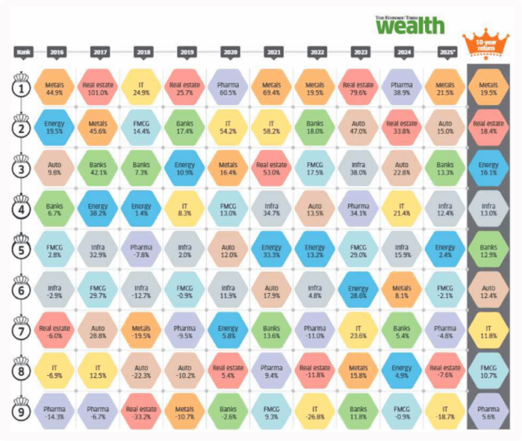 When we look at the last ten years of market data, one thing becomes clear: every sector performs differently in every year. Some sectors give very high returns in one year and then fall to the bottom in the next. This shows that no single sector stays strong all the time, and market cycles keep changing.
