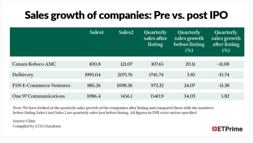 Many recent IPOs have shown a clear pattern when it comes to their sales numbers. Before listing, several companies reported strong quarterly sales growth. In some cases, the growth looked very impressive, even showing double-digit gains. But once the listing happened, the same companies suddenly showed a sharp fall in sales growth. The numbers even turned negative in many cases. (see the image below)