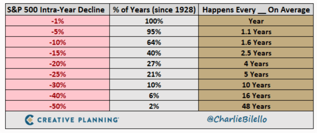 When we look at data from almost the last hundred years, one thing becomes very clear: market declines happen every year in some form. A small 1% fall happens almost every year.